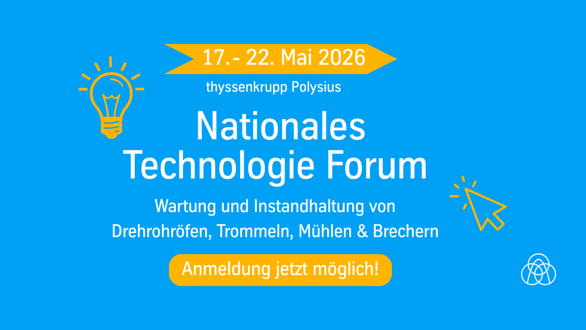 Vom 17. bis 22. Mai 2026 erwartet Sie ein umfassendes Fachprogramm rund um die Wartung und Instandhaltung von Drehrohröfen, Trommeln, Mühlen und Brechern. Nutzen Sie die Gelegenheit, Ihr Wissen zu vertiefen, wertvolle Einblicke in aktuelle Entwicklungen zu gewinnen und sich mit unseren Experten auszutauschen.